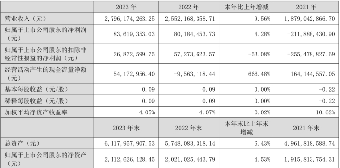 挖贝网4月25日,天汽模 近日发布2023年年度报告,报告期内公司实现营业收入2,796,174,263.25元,同比增长9.56%;归属于上市公司股东的净利润83,619,353.03元,同比增长4.28%。