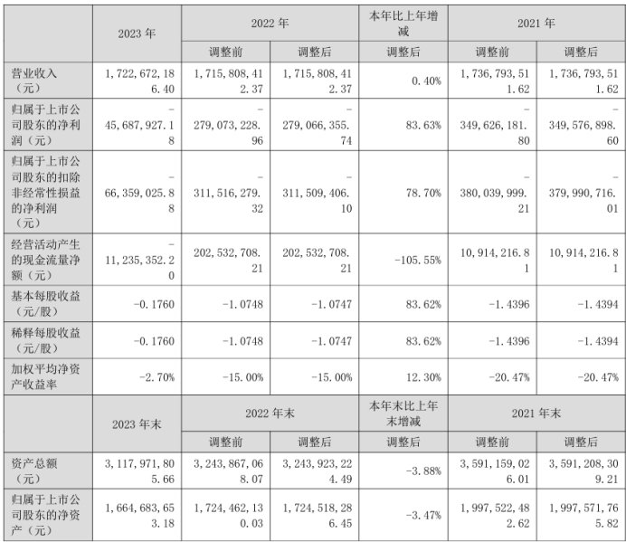 挖贝网4月25日,苏大维格 近日发布2023年年度报告,报告期内公司实现营业收入1,722,672,186.40元,同比增长0.40%;归属于上市公司股东的净利润-45,687,927.18元,较上年同期亏损减少。