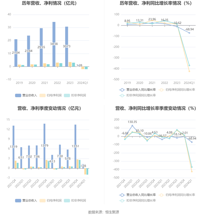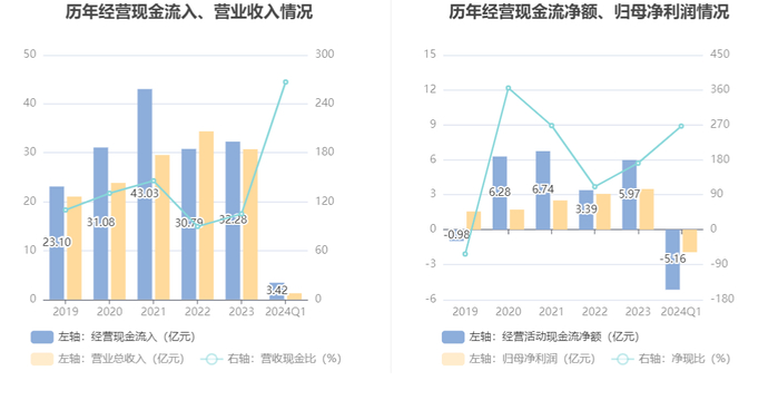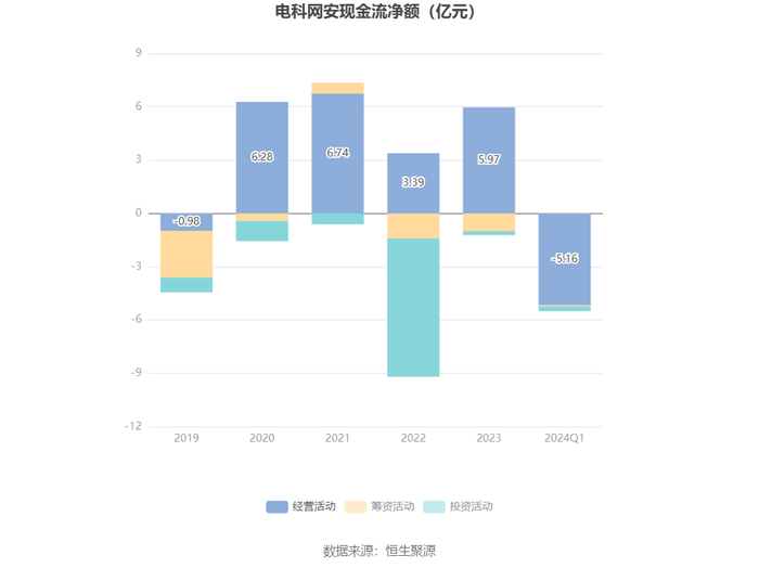 2024年第一季度,公司经营活动现金流净额为-5.16亿元,同比减少1.91亿元;筹资活动现金流净额-564.66万元,同比增加924.02万元;投资活动现金流净额-2750.69万元,上年同期为-2623.48万元。