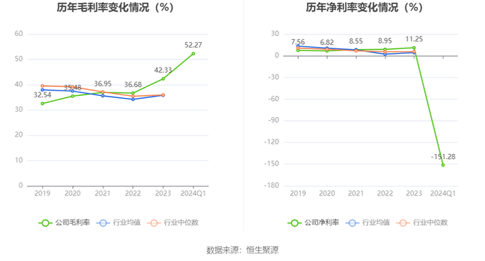 2024年第一季度,公司毛利率为52.27%,同比下降0.12个百分点;净利率为-151.28%,较上年同期下降142.35个百分点。