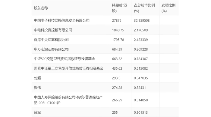 一季报显示,2024年一季度末公司十大流通股东中,新进股东为韩军,取代了上年末的百年人寿保险股份有限公司-自有资金。在具体持股比例上,申万宏源证券有限公司、中证500交易型开放式指数证券投资基金持股有所上升,香港中央结算有限公司、国泰中证军工交易型开放式指数证券投资基金、刘超、郭伟、中国人寿保险股份有限公司-传统-普通保险产品-005L-CT001沪持股有所下降。