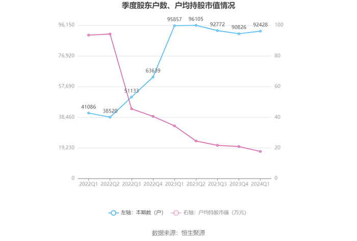 筹码集中度方面,截至2024年一季度末,公司股东总户数为9.24万户,较上年末增长了1602户,增幅1.76%;户均持股市值由上年末的20.91万元下降至17.70万元,降幅为15.35%。