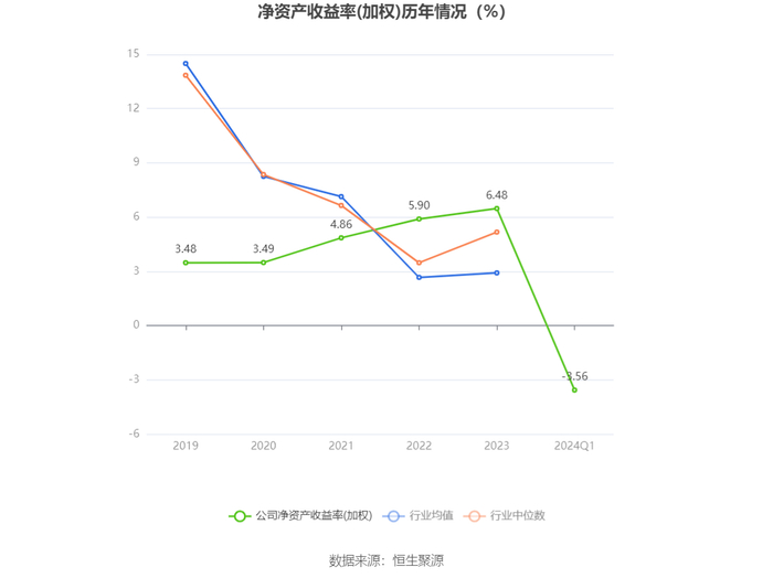 数据显示,2024年第一季度公司加权平均净资产收益率为-3.56%,较上年同期下降2.85个百分点;公司2024年第一季度投入资本回报率为-4.51%,较上年同期下降3.48个百分点。