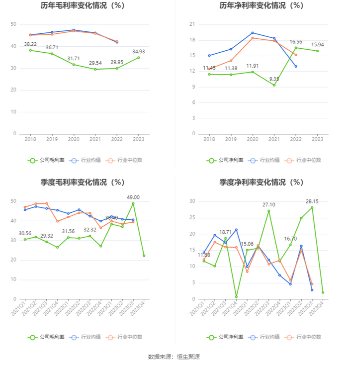2023年,公司毛利率为34.93%,同比上升4.98个百分点;净利率为15.94%,较上年同期下降0.62个百分点。从单季度指标来看,2023年第四季度公司毛利率为22.26%,同比下降4.86个百分点,环比下降26.74个百分点;净利率为2.04%,较上年同期下降9.63个百分点,较上一季度下降26.11个百分点。
