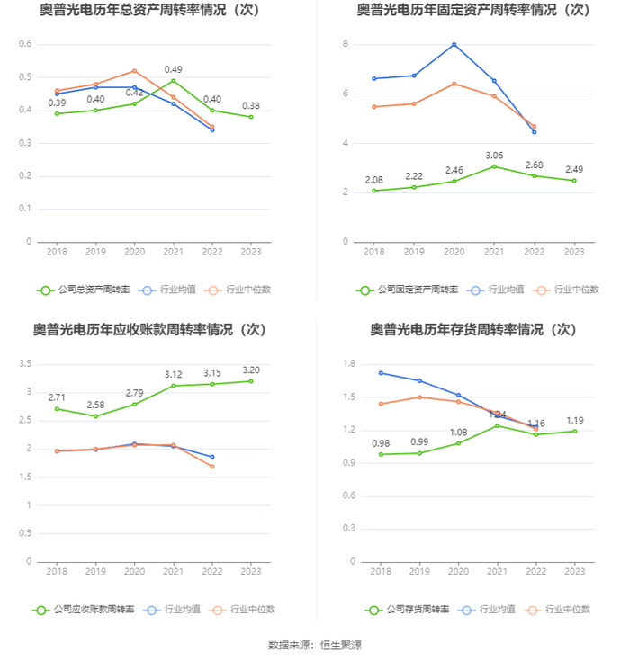 营运能力方面,2023年,公司公司总资产周转率为0.38次,上年同期为0.40次(2022年行业平均值为0.34次,公司位居同行业23/60);固定资产周转率为2.49次,上年同期为2.68次(2022年行业平均值为4.45次,公司位居同行业41/60);公司应收账款周转率、存货周转率分别为3.20次、1.19次。