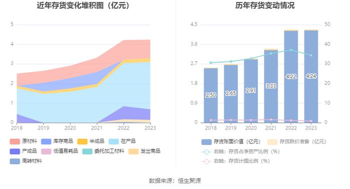 从存货变动来看,截至2023年年末,公司存货账面价值为4.24亿元,占净资产的34.4%,较上年末增加176.43万元。其中,存货跌价准备为399.42万元,计提比例为0.93%。