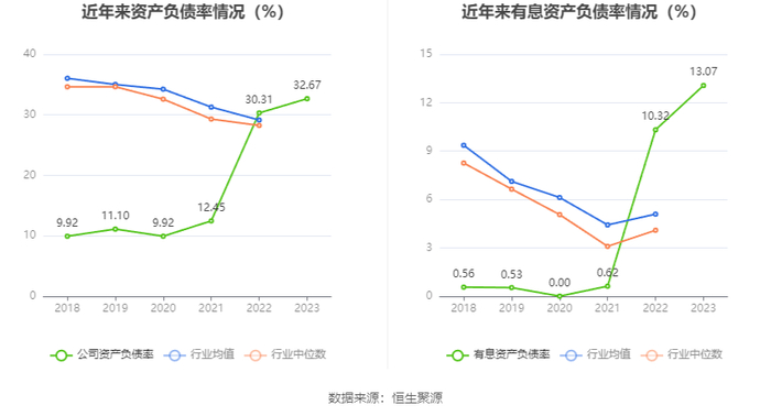 在偿债能力方面,公司2023年年末资产负债率为32.67%,相比上年末上升2.36个百分点;有息资产负债率为13.07%,相比上年末上升2.75个百分点。
