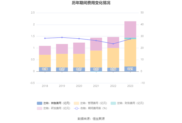 2023年,公司期间费用为2.14亿元,较上年同期增加6625.90万元;期间费用率为27.70%,较上年同期上升4.10个百分点。其中,销售费用同比增长31.24%,管理费用同比增长39.0%,研发费用同比增长46.7%,财务费用同比增长10326.11%。
