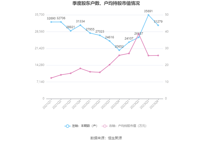 筹码集中度方面,截至2023年年末,公司股东总户数为3.13万户,较三季度末下降了4412户,降幅12.36%;户均持股市值由三季度末的25.75万元上升至25.82万元,增幅为0.27%。