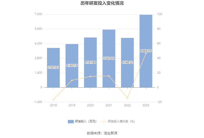 2023年全年,公司研发投入金额为6966.26万元,同比增长46.70%;研发投入占营业收入比例为9.01%,相比上年同期上升1.44个百分点。此外,公司全年研发投入资本化率为0。
