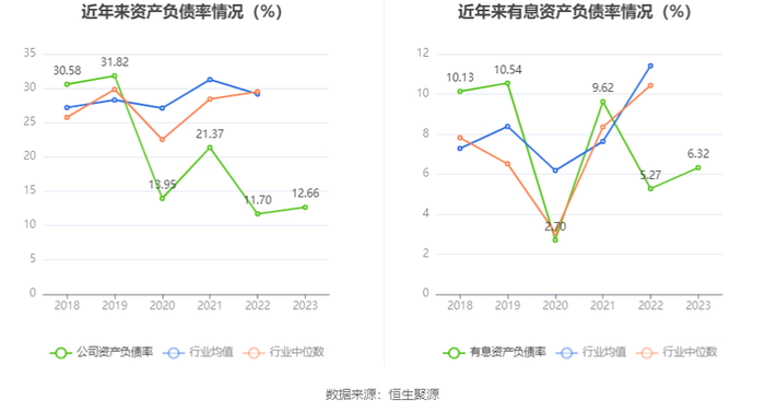 在偿债能力方面,公司2023年年末资产负债率为12.66%,相比上年末上升0.96个百分点;有息资产负债率为6.32%,相比上年末上升1.05个百分点。