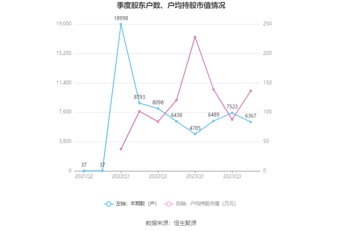 筹码集中度方面,截至2023年年末,公司股东总户数为6367户,较三季度末下降了1156户,降幅15.37%;户均持股市值由三季度末的87.84万元上升至136.46万元,增幅为55.35%。