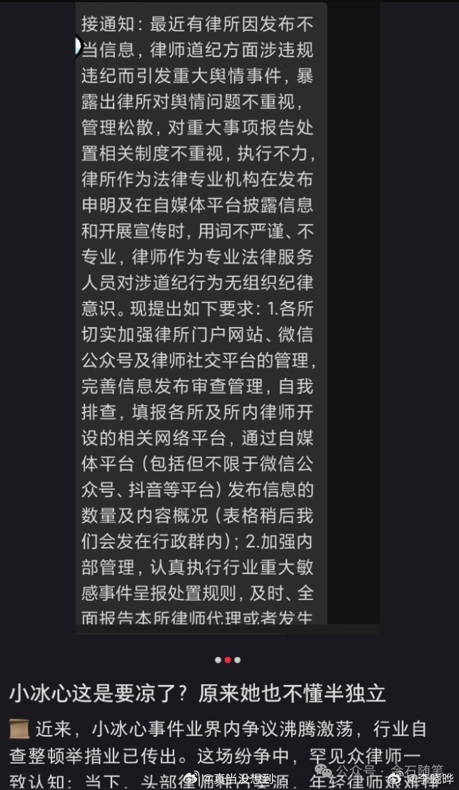 三是,本次小冰心事件已经上升到行业事件,网传有关部门下发通知要求所有律所进行行业自查整顿加强管理,以后律师们的社交账号大概率也要纳入律协监管了。