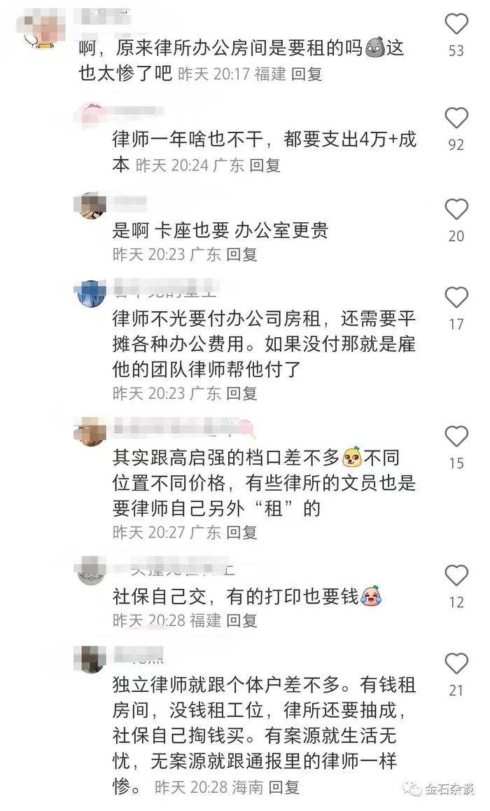 有知情网友表示,“律师一年啥也不干,都要支出4万+成本”,“卡座也要,办公室更贵”,“律师不光要付办公室房租,还要平摊各种办公费用”,“社保自己交,有的打印也要交钱”。你以为律师是有编制的,其实什么福利也没有,要分摊各种费用;而独立律师更为严重,除了管理费,社保、公积金全部自己交。