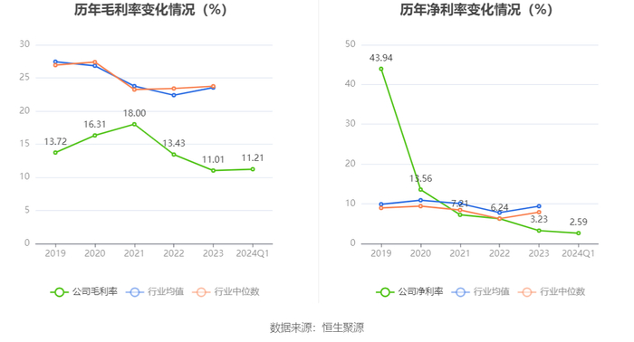 2024年第一季度,公司毛利率为11.21%,同比下降1.55个百分点;净利率为2.59%,较上年同期下降0.65个百分点。