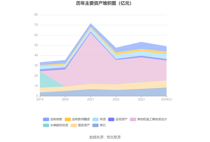 资产重大变化方面,截至2024年一季度末,公司其他权益工具投资合计较上年末减少17.47%,占公司总资产比重下降4.54个百分点;应收账款较上年末减少26.34%,占公司总资产比重下降2.54个百分点;预付款项较上年末增加121.88%,占公司总资产比重上升2.21个百分点;应收款项融资较上年末增加22.02%,占公司总资产比重上升1.39个百分点。