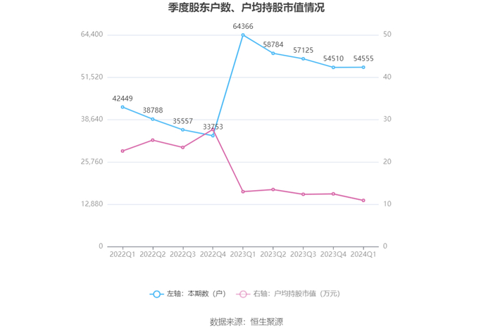筹码集中度方面,截至2024年一季度末,公司股东总户数为5.46万户,较上年末增长了45户,增幅0.08%;户均持股市值由上年末的12.48万元下降至10.94万元,降幅为12.34%。