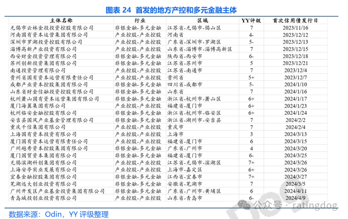 地方层面,在传统城投新增受限的背景下,地方国企中的产业控股和多元金融主体发行人增多,借此来缓解债务压力。2024年以来已有17家相关主体首发信用债,但多以沿海省份为主。