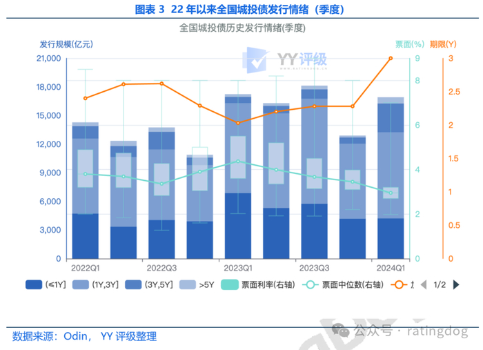 从发行情绪上看,城投债发行情绪高涨,近一年来发行票面利率持续走低、期限逐步拉长,一季度发行票面中位数为2.95%,平均期限为2.78年。