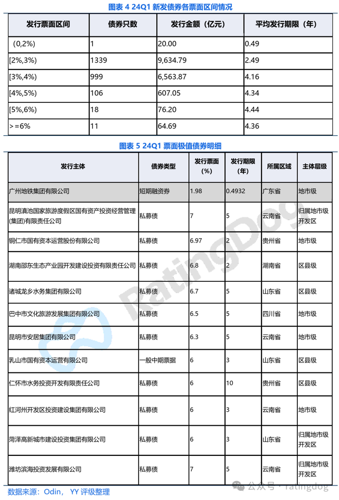 具体来看,一季度新发债券的票面利率主要分布在2%-4%的区间内,发行金额占比达到95.5%。广州地铁发行的一只短融票面利率低至1.98%。此外,云、贵、川、鲁等地仍有票面利率大于等于6%的债券发行,以私募债为主,主体均属于地市(含开发区)、区县等中低层级。