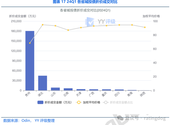 同时,全国二级折价成交数量和规模大幅下降,24Q1仅出现230笔折价成交,成交金额合计25.38亿元,同比下降96.3%;其中,71%的折价成交出现在贵州,加权平均价格大幅下降至74元。