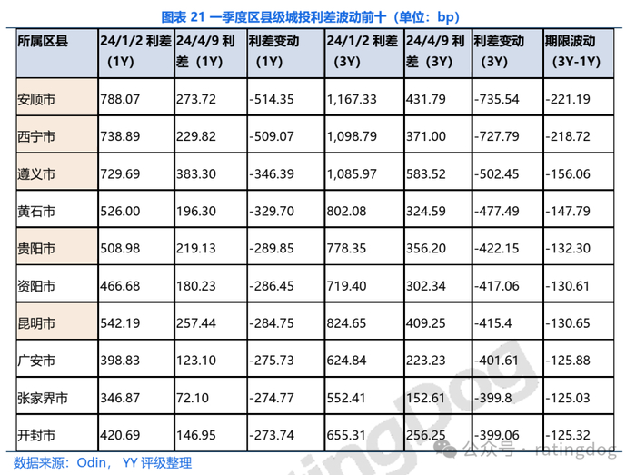 具体到区县一级,24年以来安顺、西宁、遵义等地区县级一年期利差收窄幅度超过500bp,二级市场认可度提升显著。且各地三年与一年期的期限利差波动绝对值均超过120bp,长端利差压缩幅度显著。