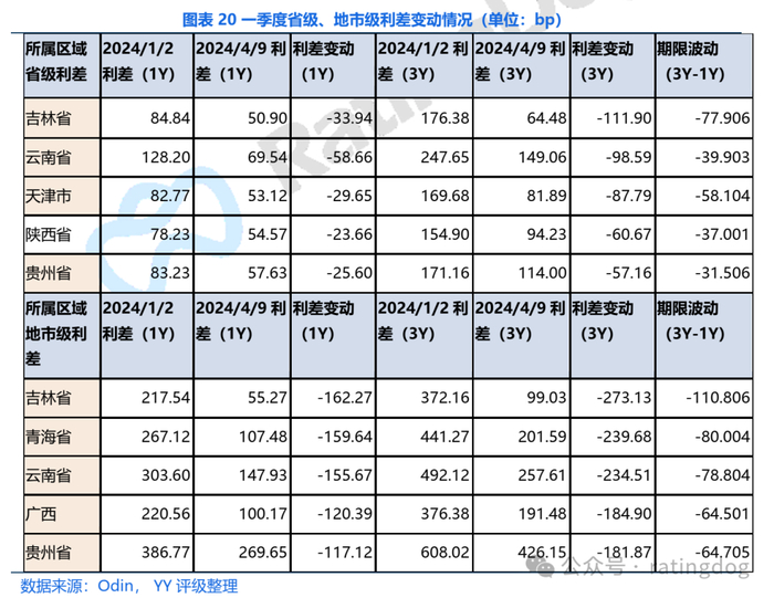 一季度各省份市级三年期利差整体仍然呈现收敛态势,贵州、云南的利差收窄幅度明显,浙江、江苏等强势区域利差略有上行。