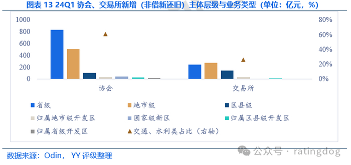 总体而言,2024年以来,城投发行情绪高涨,新发债券票面走低,集中在2%-4%之间,发行期限拉长,以3-6年的中长期债券为主。但城投净融资节奏放缓,交易所和协会的新增规模相比化债之前均出现显著下滑,平台层级高、从事交通类业务和城投成色低可能是债券新增的前置条件。