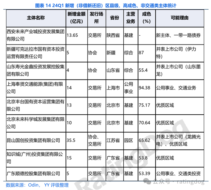 聚焦区县级、不从事交通、水利类业务且城投成色高于50%的新增主体,可发现北上广、江苏等优质区域具备一定突破交易所335限制的可能。此外,并表上市公司等产业化特征可能有利于平台在协会新增。