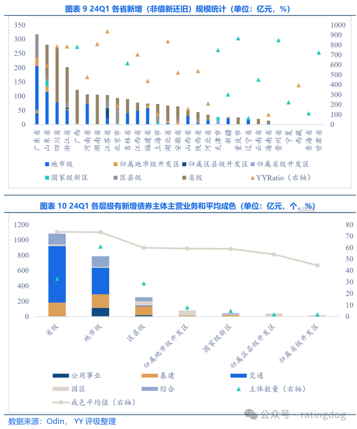 观察一季度新发债券,监管政策下仍以借新还旧为主。一季度公开发行的2,474只YY城投债券中,仅627只实现新增,金额合计2,302.9亿元。分区域来看,广东、山东、四川、浙江、广西的新增额度超过120亿元。“12个重点省份”中,广西、吉林的新增规模分别达122亿元、90亿元(多数为交通类主体),其余省市新增均不超过30亿元,重点省份新增难。