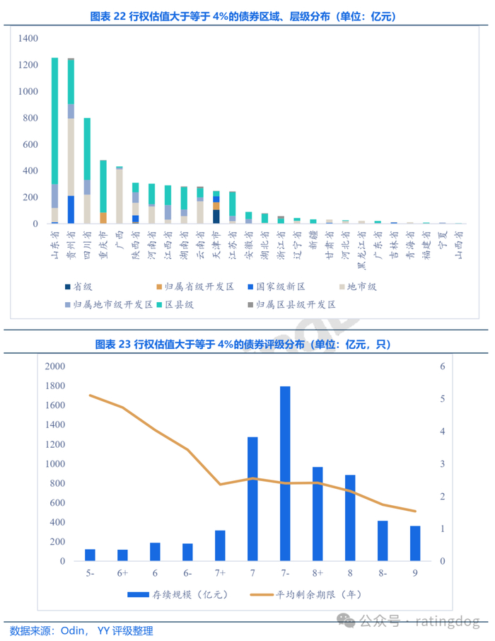 关注高估值债项,存量债券中行权估值不低于4%的债券存量规模为6,629.35亿元,共1,238只。从区域分布来看,主要还是集中在山东、贵州、四川、重庆等地。多数高收益债主体层级为区县级,但贵州、四川、广西和云南仍有相当体量的地市级平台债券估值较高。主体评级方面,以YY7-8的弱资质主体为主,YY评级6及以下的债券规模合计仅623亿元。主体下沉和拉久期成为收益挖掘的主要手段,且“收益荒”下可能需要两者同时进行。