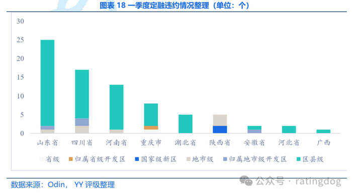 定融逾期风险事件频发,共统计到78笔违约,主要集中在区县级平台,山东、四川、河南是重灾区。