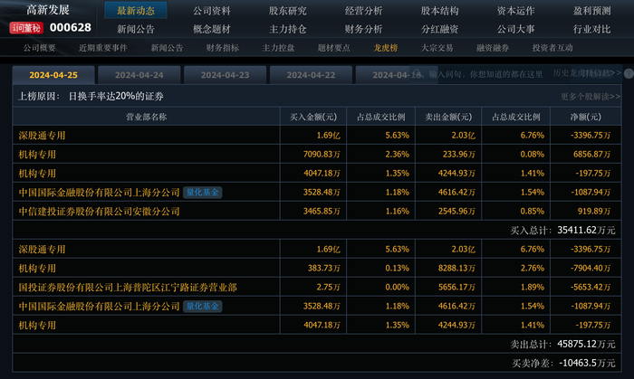 龙虎榜看,高新发展4月23日“深股通专用”席位买卖最多,当天买入1.18亿元,卖出1.73亿元,另在买卖前五席位中,各有两“机构专用”席位跻身其中。4月23日买卖前五席位的净差为1.55亿元。4月24日、25日,高新发展也有上龙虎榜,“深股通专用”席位同样占据买卖第一的位置,不过这两天买卖前五席位的净差却为负值,分别为-1824.27万元、-1.05亿元。
