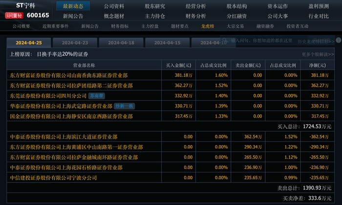 4月25日,ST宁科也上榜龙虎榜。龙虎榜显示,买入ST宁科最多的是东方财富证券山南香曲东路营业部、拉萨团结路第二营业部,买入金额381.18万元、362.27万元。