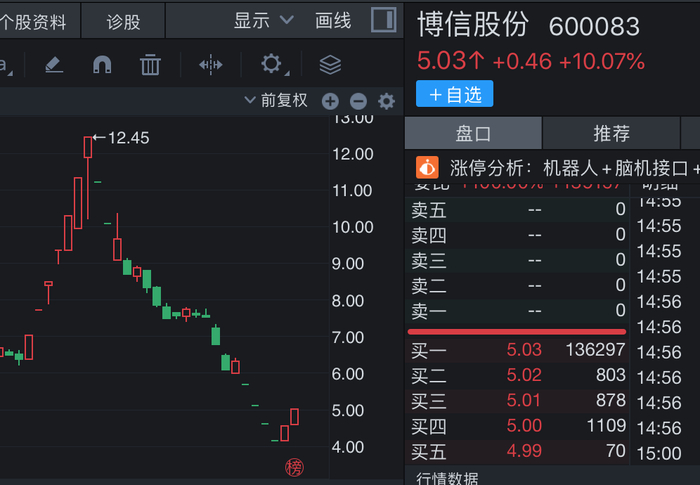 4月24日,博信股份(600083.SH)硬扛前面四个“一字跌停”,开盘硬拉涨停,4月25日继续完成涨停。