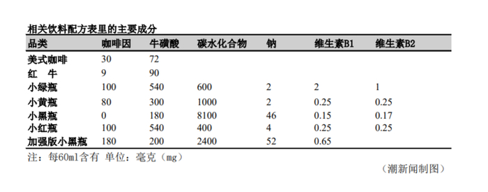 对此,多个商家含糊其词,不清楚配方。比如某品牌“小黑瓶”营养成分表有瓜拉纳提取物(咖啡因含量比咖啡豆高),不过商家称“不含咖啡因”,记者对其纠正后,商家又改口称“提取物含有少量咖啡因”。此外,一些店铺客服向记者发来的饮品成分表与瓶身标识不一,也说不出具体成分含量,甚至推荐使用量。