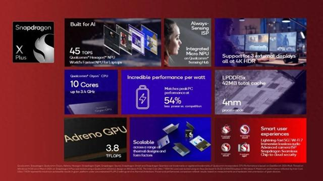 【环球网科技综合报道】近日,高通公司进一步扩展了其笔记本电脑芯片系列,推出了全新的Snapdragon X Plus芯片。该芯片是基于4nm工艺和Arm架构的Oryon CPU架构,与去年秋天公布的旗舰级芯片Snapdragon X Elite共享技术基础。