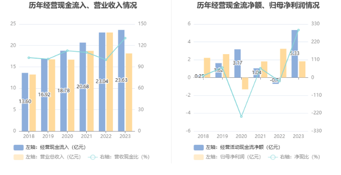 2023年,公司营业收入现金比为130.26%,净现比为293.26%。