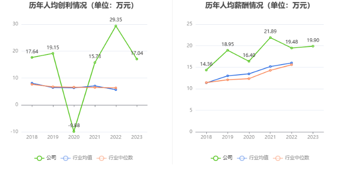 截至2023年末,公司员工总数为1067人,人均创收170.03万元,人均创利17.04万元,人均薪酬19.90万元,较上年同期分别变化-18.66%、-41.92%、2.17%。