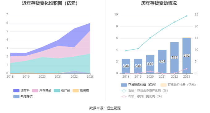 从存货变动来看,截至2023年年末,公司存货账面价值为6.02亿元,占净资产的24.52%,较上年末增加6552.71万元。其中,存货跌价准备为1242.0万元,计提比例为2.02%。