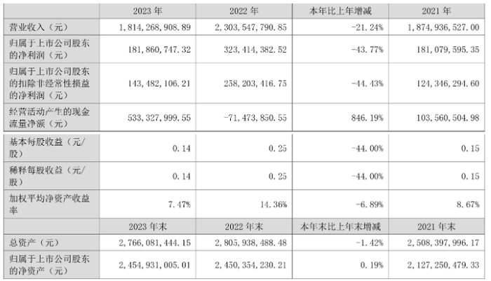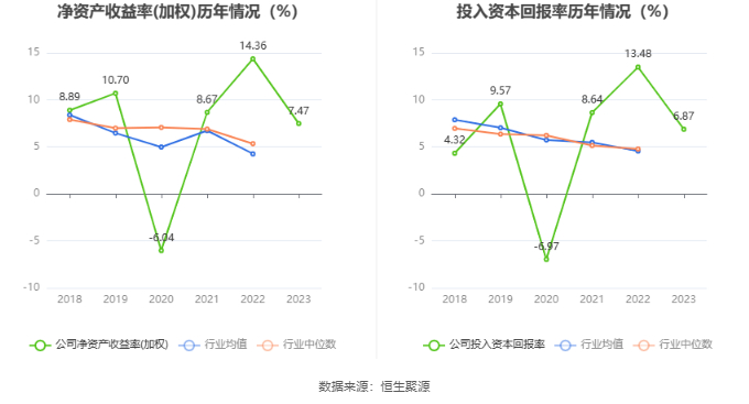 数据显示,2023年公司加权平均净资产收益率为7.47%,较上年同期下降6.89个百分点;公司2023年投入资本回报率为6.87%,较上年同期下降6.61个百分点。