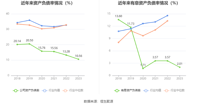 在偿债能力方面,公司2023年年末资产负债率为10.56%,相比上年末下降2.72个百分点;有息资产负债率为2.01%,相比上年末下降1.56个百分点。