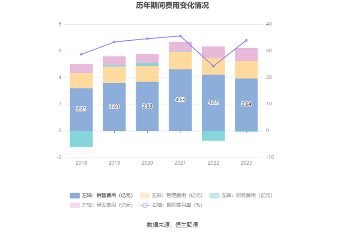 2023年,公司期间费用为6.16亿元,较上年同期增加5677.51万元;期间费用率为33.97%,较上年同期上升9.68个百分点。其中,销售费用同比下降6.62%,管理费用同比增长6.55%,研发费用同比增长9.93%,财务费用由去年同期的-7419.52万元变为-639.21万元。