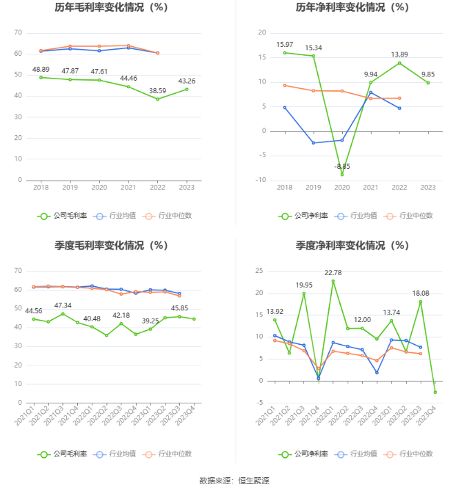 2023年,公司毛利率为43.26%,同比上升4.67个百分点;净利率为9.85%,较上年同期下降4.04个百分点。从单季度指标来看,2023年第四季度公司毛利率为44.65%,同比上升8.13个百分点,环比下降1.20个百分点;净利率为-2.58%,较上年同期下降12.16个百分点,较上一季度下降20.66个百分点。