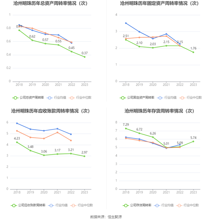 营运能力方面,2023年,公司公司总资产周转率为0.37次,上年同期为0.45次(2022年行业平均值为0.58次,公司位居同行业15/22);固定资产周转率为1.76次,上年同期为2.15次(2022年行业平均值为2.26次,公司位居同行业11/22);公司应收账款周转率、存货周转率分别为2.97次、5.74次。