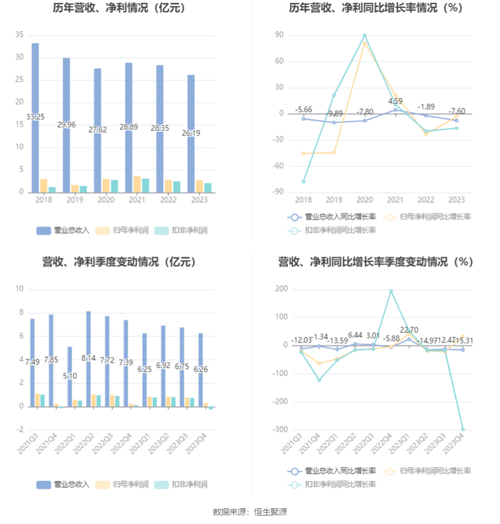 中证智能财讯 沧州明珠(002108)4月26日披露2023年年报。2023年,公司实现营业总收入26.19亿元,同比下降7.60%;归母净利润2.73亿元,同比下降2.99%;扣非净利润2.08亿元,同比下降16.36%;经营活动产生的现金流量净额为3.44亿元,同比增长19.91%;报告期内,沧州明珠基本每股收益为0.1639元,加权平均净资产收益率为5.31%。公司2023年年度利润分配预案为:拟向全体股东每10股派1元(含税)。
