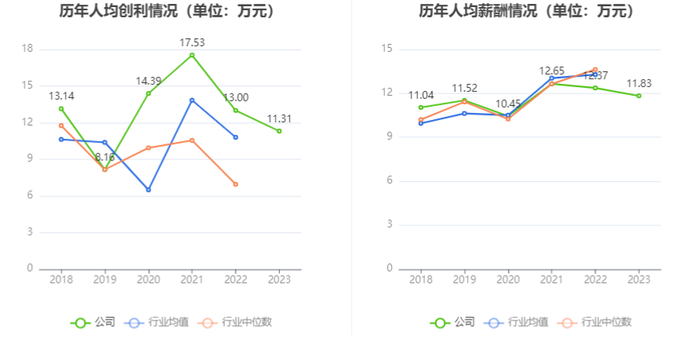 截至2023年末,公司员工总数为2410人,人均创收108.67万元,人均创利11.31万元,人均薪酬11.83万元,较上年同期分别下降17.11%、12.98%、4.38%。