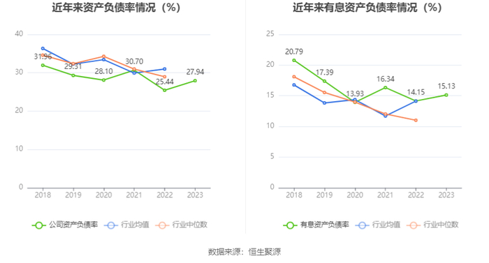 在偿债能力方面,公司2023年年末资产负债率为27.94%,相比上年末上升2.50个百分点;有息资产负债率为15.13%,相比上年末上升0.98个百分点。