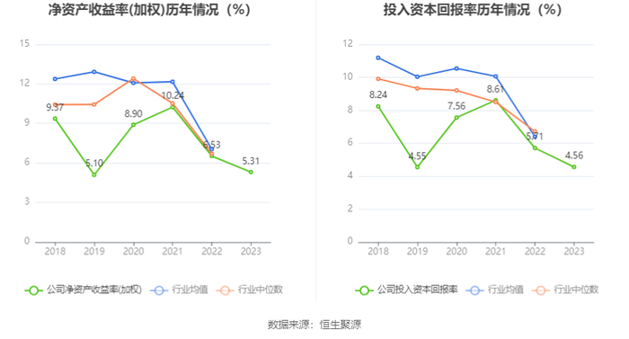 数据显示,2023年公司加权平均净资产收益率为5.31%,较上年同期下降1.22个百分点;公司2023年投入资本回报率为4.56%,较上年同期下降1.15个百分点。