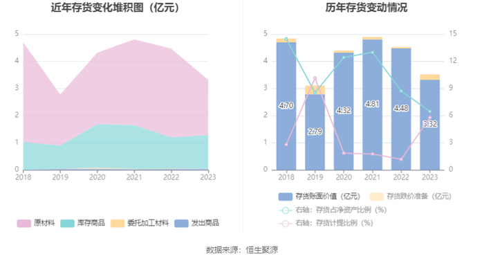 从存货变动来看,截至2023年年末,公司存货账面价值为3.32亿元,占净资产的6.48%,较上年末减少1.16亿元。其中,存货跌价准备为2044.35万元,计提比例为5.8%。